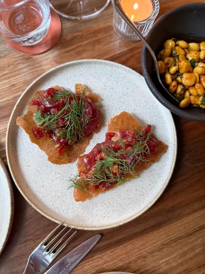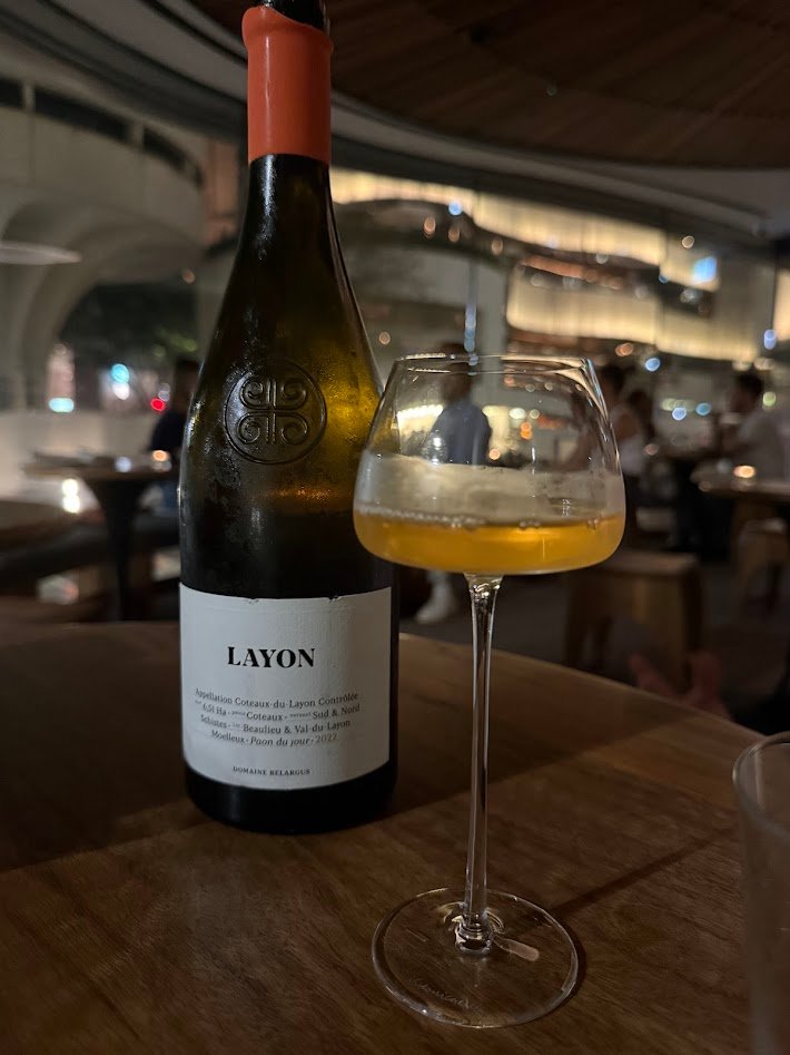 Mr G has arrived and leans into a 2024 Alkina Estate Grenache. Pale, perfumed with rose and spice, light tannins and juicy cranberry fruit. Organic too. We finish with a surprise pour from Jacob, gently guided by our recent Burgundy holiday reminiscing. He appears with a 2022 Coteaux du Layon Moelleux. Sweet, but appealing for people who don’t like sweet wines. Pineapple, warm spice, a whisper of toffee. I am in love with the glassware.