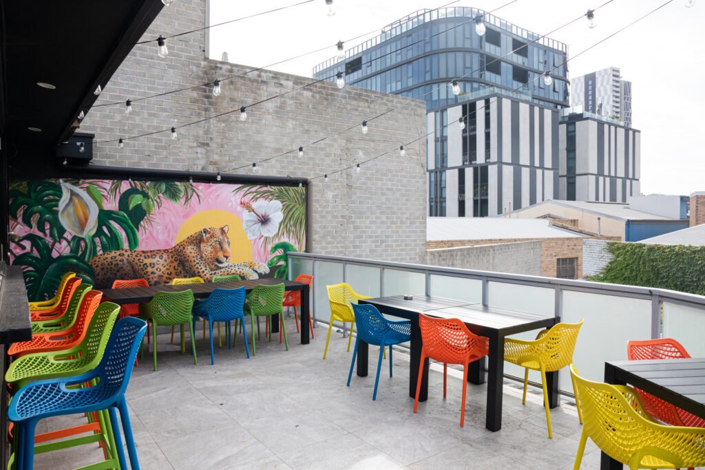 The journey continues. High heels may have posed a problem when you see the skinny narrow staircase with giant steps. But, it’s well worth the trek. At the top sits a disco jungle room with retro flair. Think disco balls, sparkle and forest leaves fused into one big party space. Step outside to the rooftop bar for fresh air and skyline views of the city.