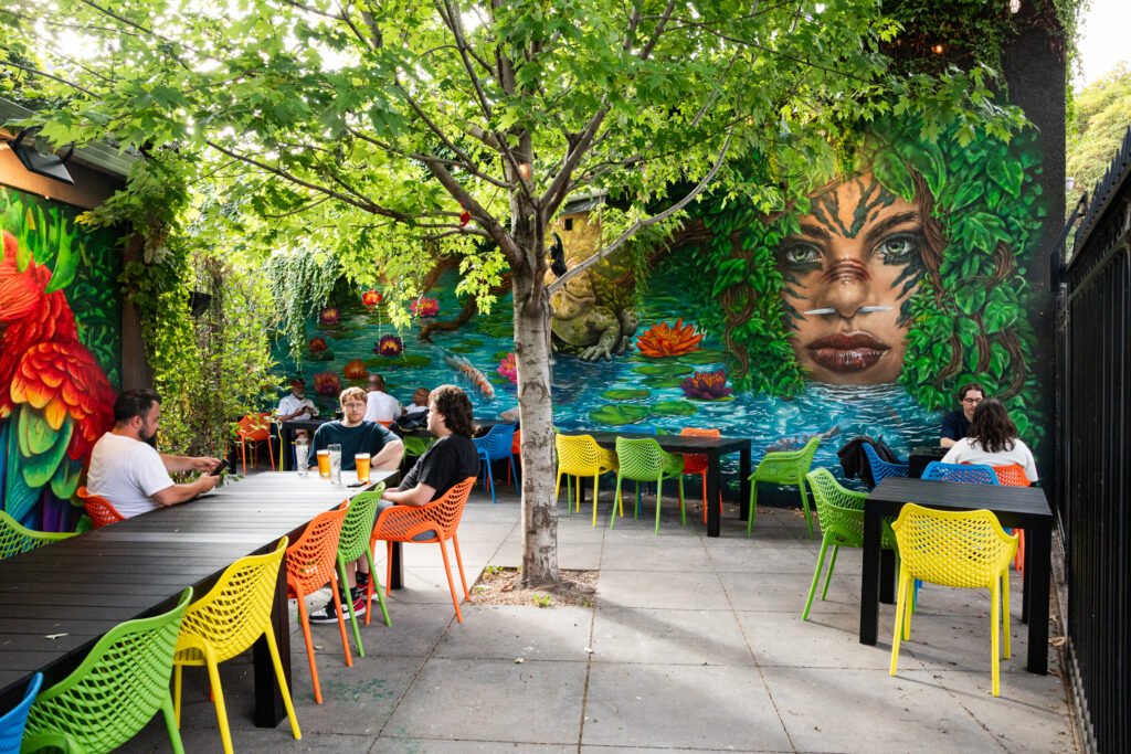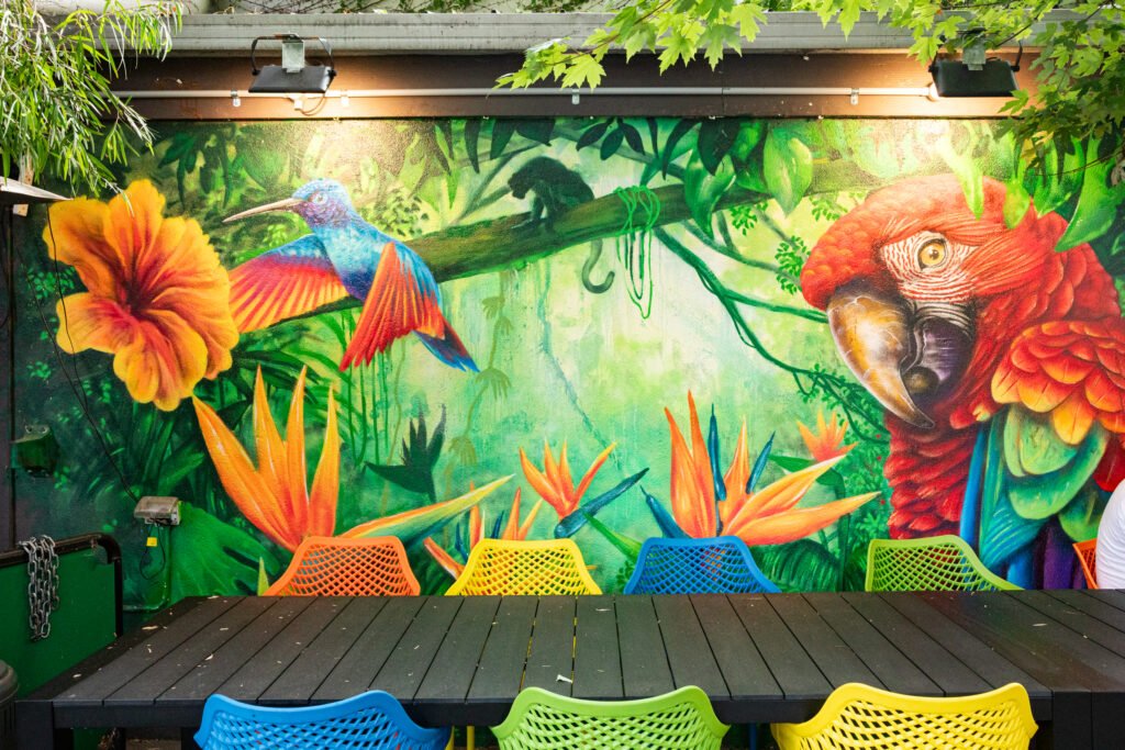 The outdoor beer garden sets the tone with colourful chairs, playful décor and lush greenery. Murals climb the walls, jungle scenes with tigers, bullfrogs and rainbow parrots watching over you as you sip a chardonnay. A striking woman with piercing green eyes stares out, her flowing hair morphing into leaves. It is the kind of place where afternoon drinks turn into pizza and another round. Intentionally child friendly, kids can explore quirky details like monkeys swinging from branches, and yes, it is pet friendly too.