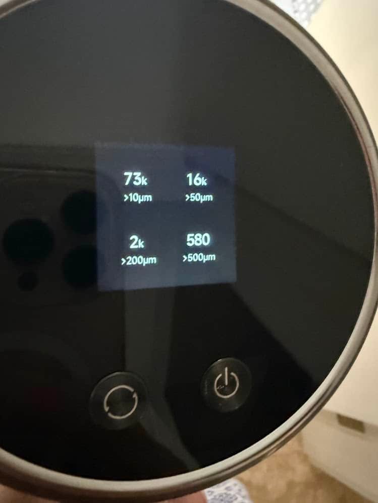 The display isn’t just showing battery and mode, (there are three: Eco, Auto and Turbo) it’s actively telling me what I’m cleaning in real time, like a horror movie, I am watching to see if the ‘mite visual’ goes off. There are four circular indicators, each representing different particle sizes: