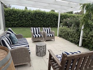 The lounge area has doors which create separate living space. Right now, Rita is having a snooze on the sofa, Maggie has laid down alongside her on the rug. It’s the chillax area. Phil has found the chairs in the formal dining room whilst Mr G and I are outside in the covered garden area working. Mr G is sipping a glass of wine at the outdoor dining table whilst I’m on the Hamptons-style loungers. Birds are singing, peace fills the space where noise once was. It’s gloriously rejuvenating to be in nature.