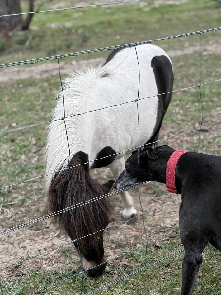 Before we even get into the house, the greys are out investigating. They’ve found the long stretch of grassed garden that adjoins the fenced pony fields. Princess, the little black and white Shetland pony, softly trots up from the back of the field to say hello! At only 5 years old, she’s super sweet but a bit of a greedy guts – hence the sad muzzle she has to wear. A few head scratches and pats later, greys and ponies are greeting each other.