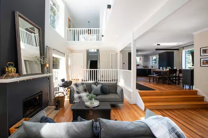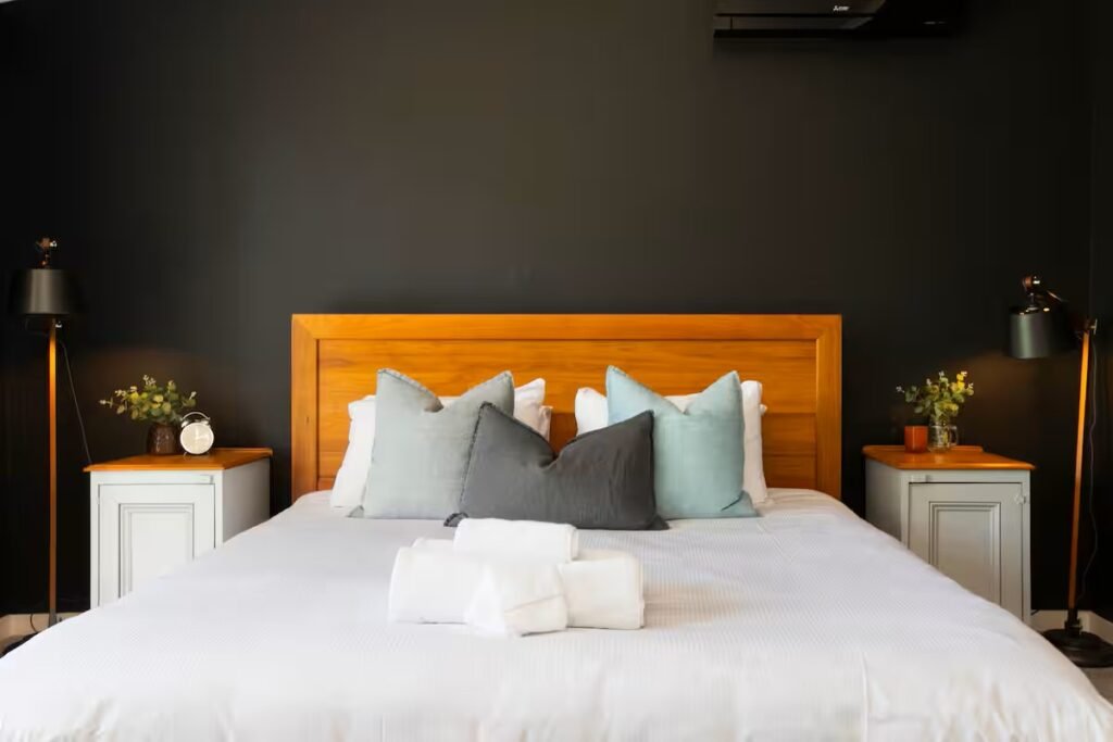 There’s also a queen bedroom downstairs (perfect for guests who prefer single level living), a second king bedroom upstairs with its own ensuite and walk-in robe (complete with portacot storage for families), and a bunk bedroom tucked near the upstairs bookshelf nook.