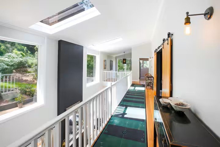 It’s like Southfork. Carpeted stairs wind upwards, with wrap around hallways which look over and into the void of the lounge below. The long runway has been playfully turned into a putting lane with a golf mat, with targets and grids. It’s a highlight for Mr G and I to grab the golf clubs and get competitive.