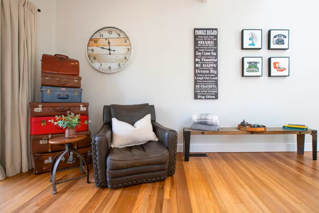 The kitchen is the heart of the house. The dining room table and chairs on an upper level connect us to our pup family snoozing below. I love how the hosts have stocked a great selection of herbs, soy sauces and condiments. All the cleaning products are eco-friendly. It’s well stocked with a few gadgets including an awesome rice cooker which I give a work out.