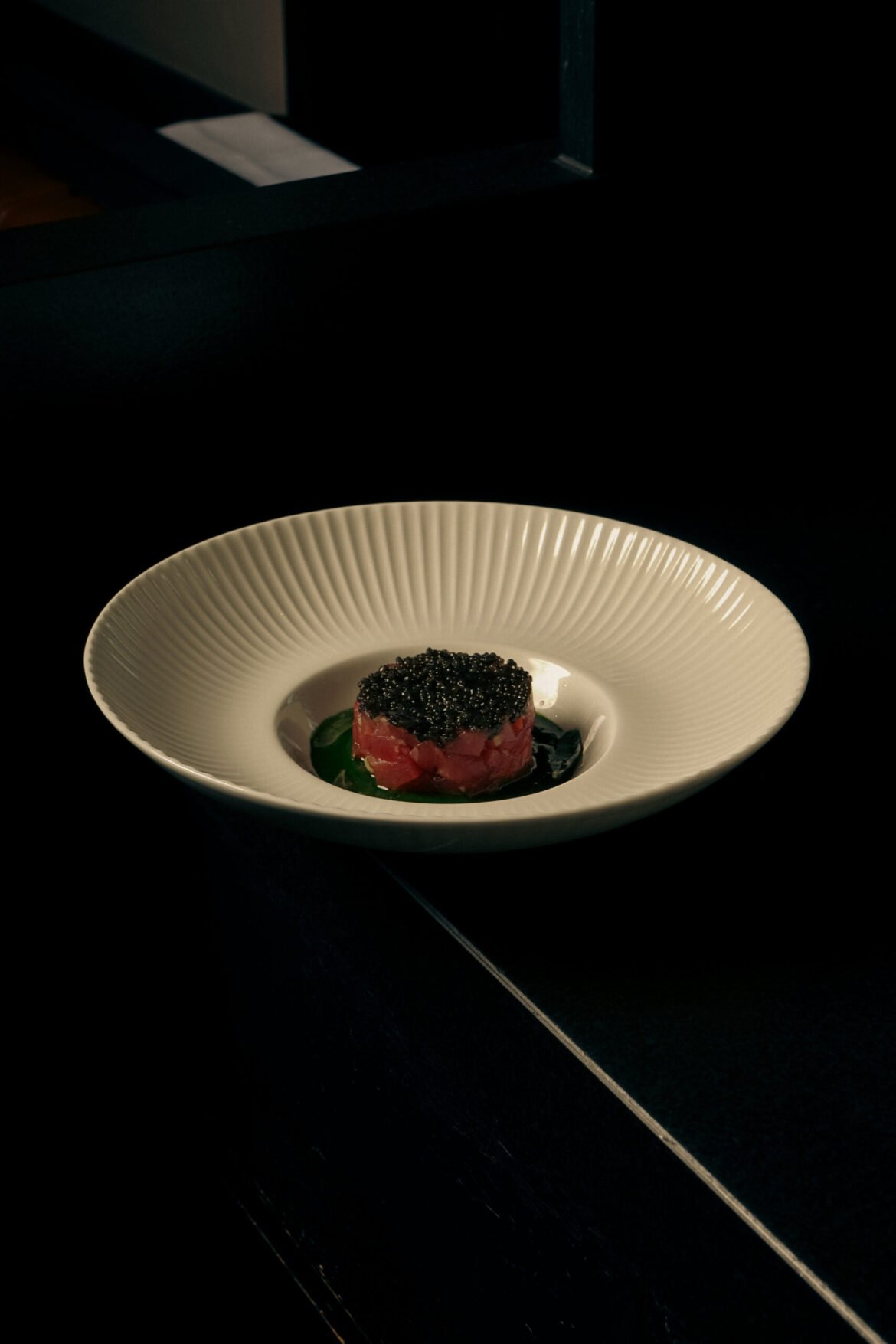 The next fish is the opposite of light. A cylinder of Australian yellowfin raw tuna sits poignantly on a dark thick basil earthy coulis. The salty robust fish is topped with black pears of ‘Anna Dutch Baeri Caviar’ and regal gold citrus for garnish. I’m by no means a queen, but if I was, I can imagine this stary eyed dish being on repeat in a castle, both for its aesthetics, refinement and decadent deluxe.