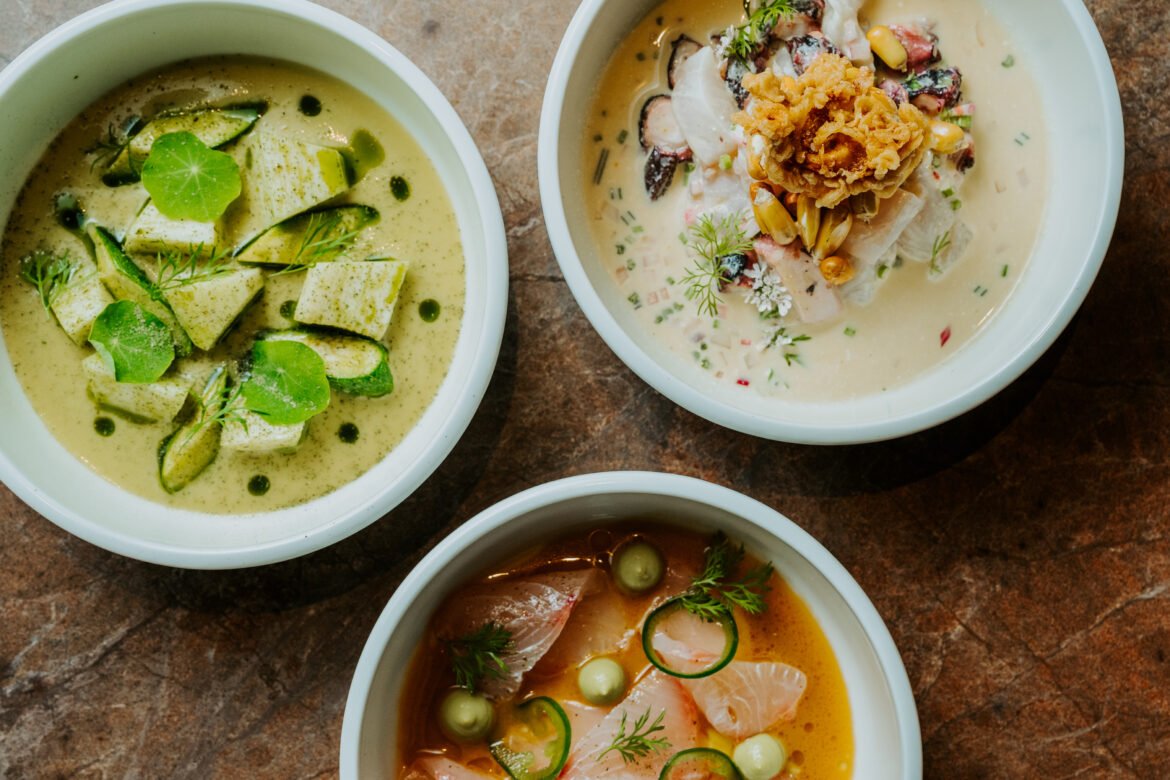 Dinner is a set menu. The team have worked on a predominantly 70% plant based, zero wastage menu showcasing heritage techniques and working with local farms to create a farm to plate experience. The onsite garden provides over 70 veggies, fruits and herbs. Everything from turmeric, ferns, mint, mangosteen and coconuts which give back calcium to plant roots.
