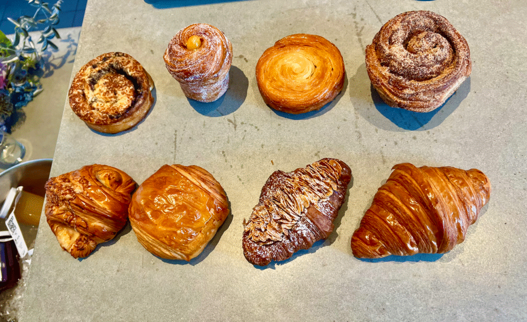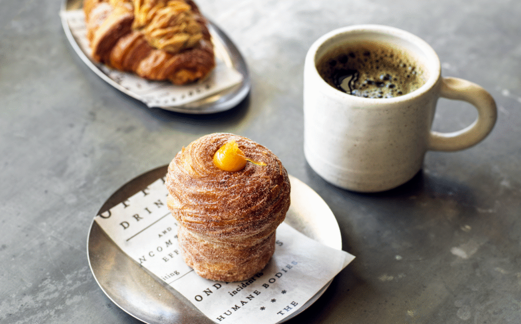 The cafes centrepiece is Kate Raids Lune Croissants. For anyone who has queued for these babies, table service is a gift. We sit in the window observing the Oxford Street shoppers and devour the savoury Ham & Gruyère and the decadent Lemon Curd Cruffin.