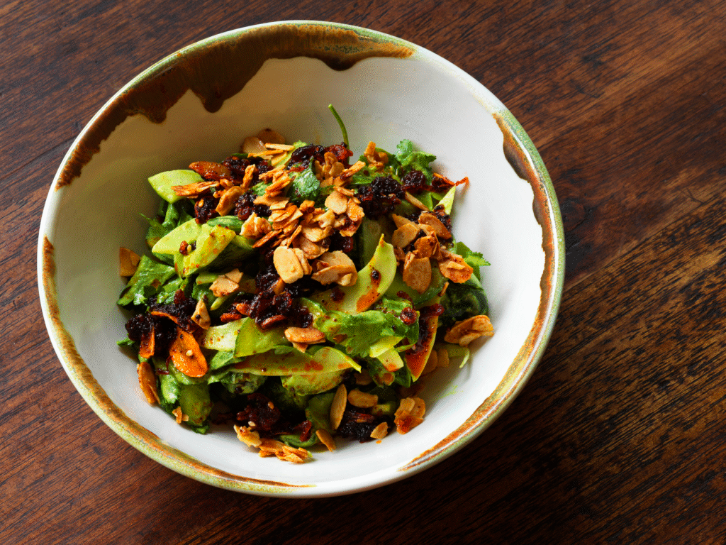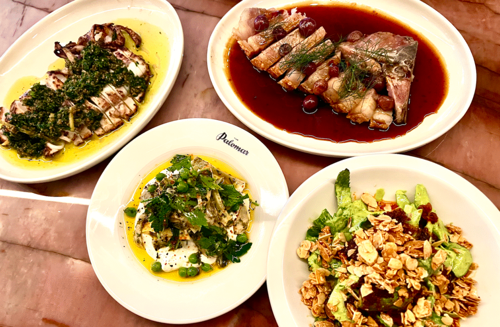We need a long chat with our delightful waiter Brett because it’s a menu with many unfamiliar dishes. Commencing fresh and flavourful with the delicately charred Grilled Abrolhos Island Scallop, Zhoug Butter and the zesty Globe Artichokes, preserved Lemon on labneh spiced with Aleppo pepper. We choose an indigenous Turkish red varietal 2022 Doluca ‘Tuğra’ Kalecik Karasi to go with the charred Berkshire pork chop, blistered grapes and smoky sherry jus. It is plate-licking good. The dish of the night goes to restaurants signature, smashed cucumbers glossed in green tahini, crispy chilli and almond clusters. What favours do we need to do get the recipe?