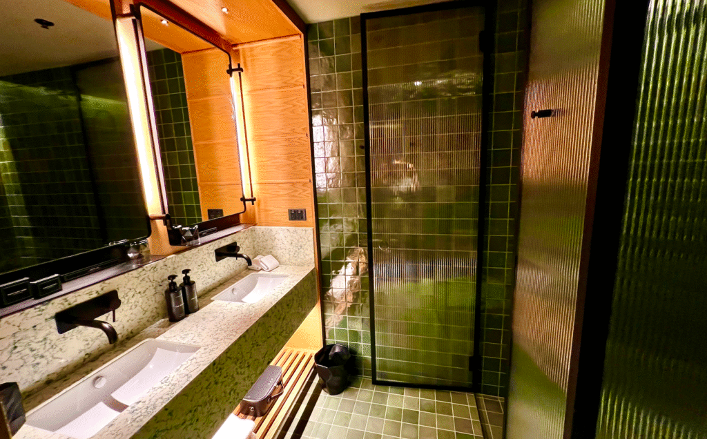 The decor is vintage flair meets contemporary style, a rotary dial phone sits on one bedside and Bluetooth speaker on the other. Elevated contrasts across the hardwood floors, glossy moss tiles, black ceiling and pop-art feature wall. The spacious bathroom features double sinks which we love, roomy shower and moody lighting. A balcony faces the Oxford Street hustle, but once the sliding door closes, it’s blissfully quiet.