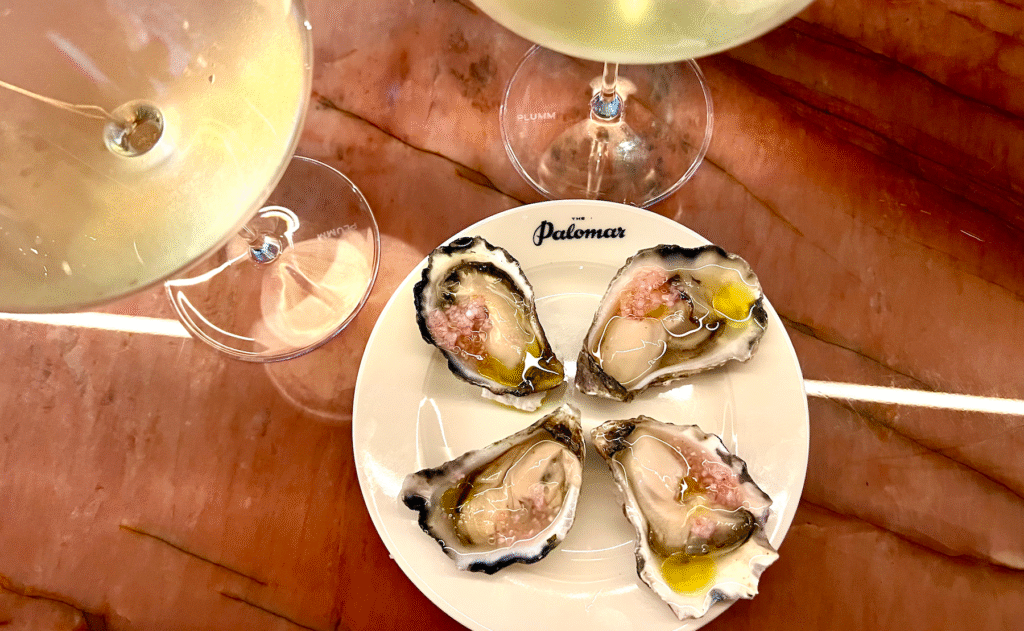 We are seated at the amber marbled chefs table with full view of the grill action, Raffi flipping hefty pieces of meat and fish greets us and gets us going with a smooth 2023 Domaine Gueguen Chablis and freshly shucked Sydney Rock oysters dressed in finger lime and EVO. They are sublime.