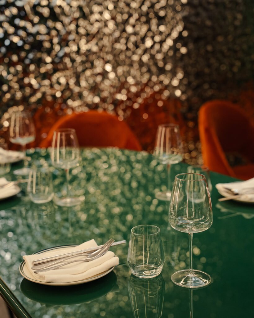 From outside, it’s almost missable. But when you walk in that door, you’re instantly awed by the stunning interior. Lush velvet burgundy booths, wooden tables and polished tables. Falling from the sky are drop down silver balls of liquid metal, a robotic futuristic vibe balanced with soft Kyoto Lux. Hard to tell that it’s actually quite a large dining room, as despite the numbers, the space creates luxury, warmth and intimacy.