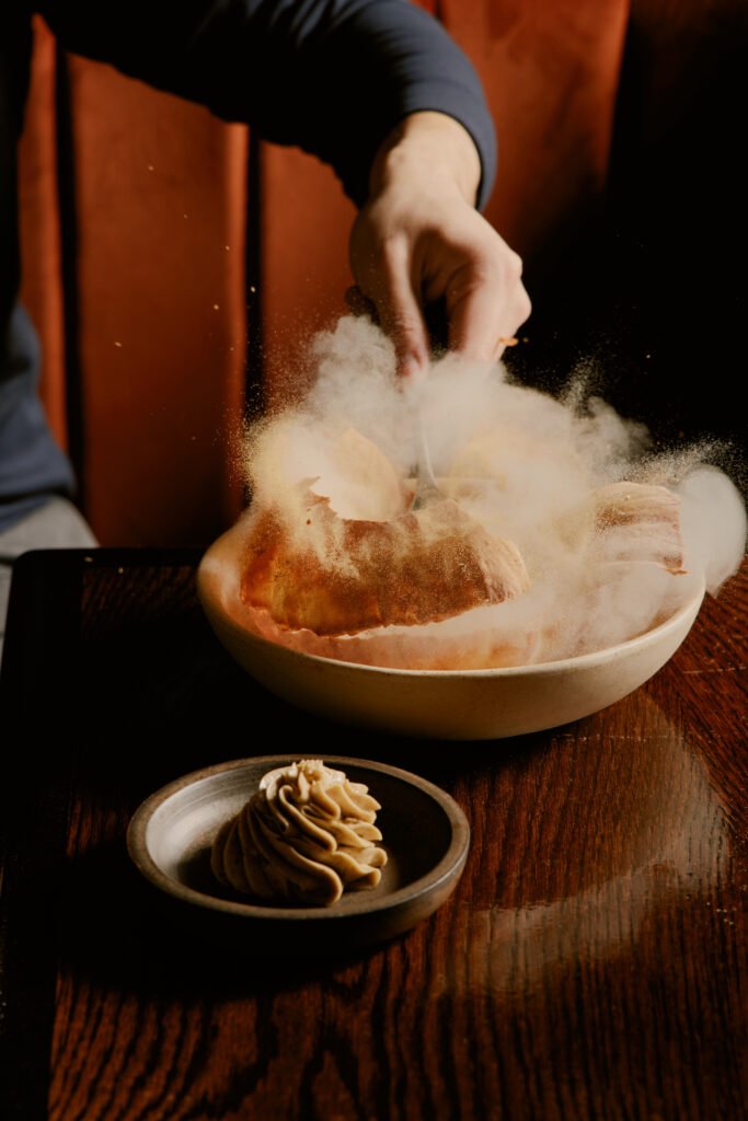 The tantalising aromas of Asian aromatic awaken your belly before you’re seated. Start with a smoked balloon cracker. A puffed ball of flatbread arrives with a big metal spoon. Smash it open and feel the puff of smoke erupt into your face. Inside, it’s laden with surprises. A one line note “They say good fortune finds the bold. You found LEXY – proof enough.’ Dip it into what looks like a replica of the top of a fancy kids cupcake icing but is actually a rich honey smoked garlic butter.